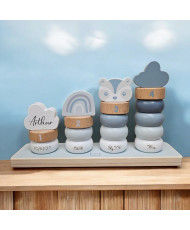 Nos tours d'empilage personnalisées sont réalisées avec soin en bois certifié FSC et peintes avec des couleurs vives et non toxiques. Chaque tour est personnalisée avec les informations de naissance de votre enfant, créant ainsi un souvenir précieux. Grâce à ses 18 pièces colorées et numérotées, votre bébé développera sa motricité fine, son imagination et ses premières notions de chiffres et de couleurs tout en s'amusant.