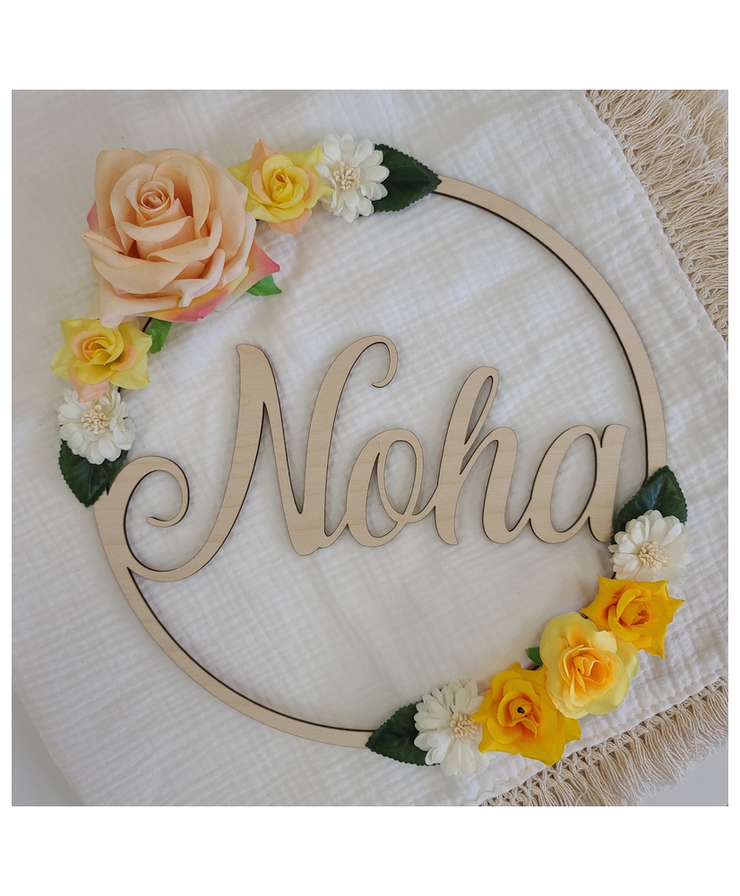 Découvrez nos couronnes fleuries avec le prénom à suspendre dans une chambre enfant pour décorer ou lors d'un évènement. D'un diamètre de 28cm, l'association de bois et de fleurs artificielles assemblées une à une par nos soins, donnera un charme unique et personnalisé à votre pièce.