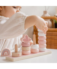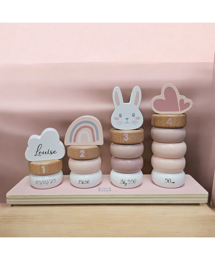 Nos tours d'empilage personnalisées sont réalisées avec soin en bois certifié FSC et peintes avec des couleurs vives et non toxiques. Chaque tour est personnalisée avec les informations de naissance de votre enfant, créant ainsi un souvenir précieux. Grâce à ses 18 pièces colorées et numérotées, votre bébé développera sa motricité fine, son imagination et ses premières notions de chiffres et de couleurs tout en s'amusant.